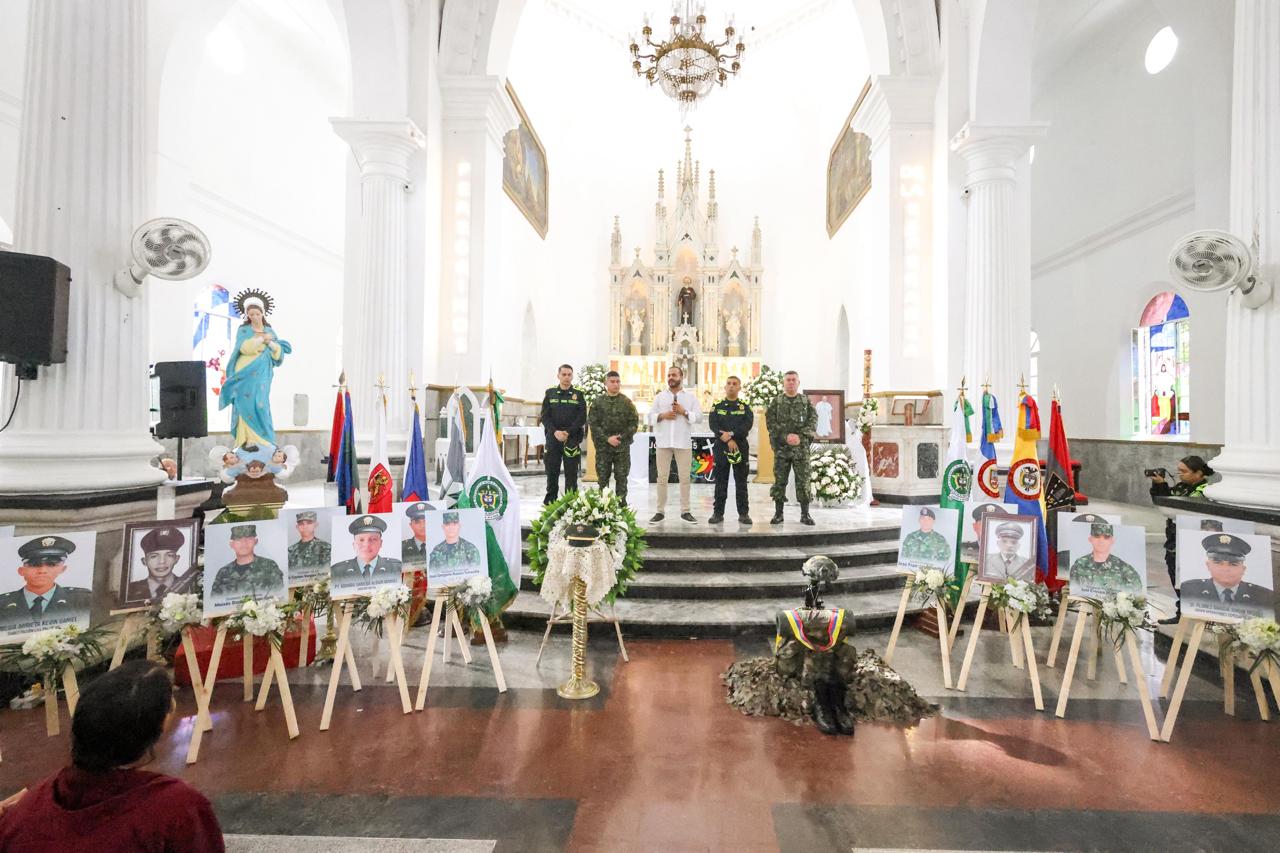 Durante la Santa Misa celebrada con la presencia de autoridades civiles y militares, el Gobernador expresó: «Nos despedimos con honor de los hombres y mujeres que entregaron su vida por defender la soberanía y la seguridad de Colombia. Nos sentimos profundamente orgullosos de ellos y de sus familias. Con esta eucaristía les manifestamos nuestra eterna gratitud y les reiteramos que no están solos y menos en estos momentos de dificultades. Ahora es cuando más necesitamos trabajar de manera articulada para seguir defendiendo la soberanía y la libertad de todos los colombianos”.