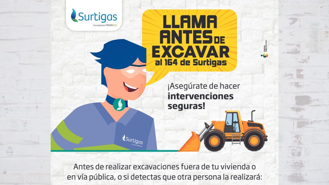 Surtigas reitera el compromiso con la seguridad de sus clientes e invita a personas naturales y a las empresas que realicen excavaciones de cualquier tipo, que antes de iniciar una obra fuera de su vivienda o en vía pública la reporten llamando a las líneas de atención: 164 o 01 8000 910 164.